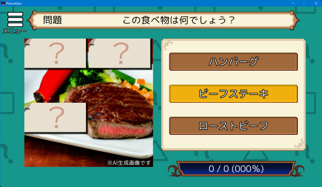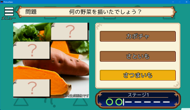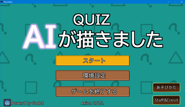 クイズ AIが描きました Last up date 2025/11/16 ジャンル:パズルゲーム リリース日:2025年6月 サンシャインクリエイション2025Summer プラットフォーム:Windows 11 プレイ人数:1人 AIが何を描いたかを当てよう