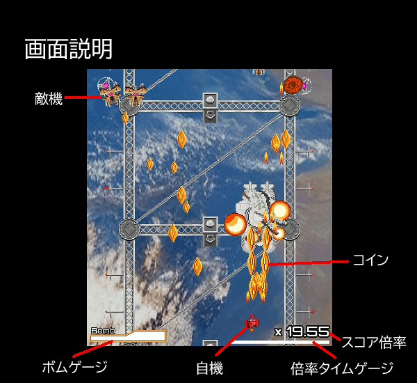 ボムは、「レーザー系以外の」ほとんどの敵弾を得点アイテムに変換できます。ボム使用中は無敵ですが、発動の終わり際(赤い帯がしぼみ始める)で